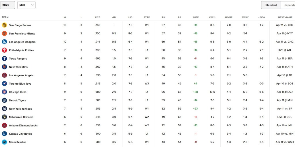 Friars are the first team to 10 wins this season (what?), sit in 1st in the NL West (what?), 1st in the National League (what?), and have the best record in the Major Leagues despite two teams playing more games than they have so far (what?).